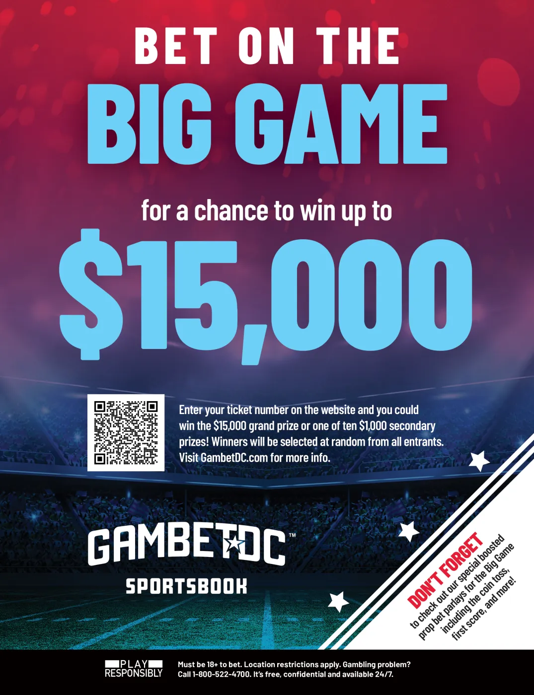 If you placed a bet on the Big Game using your registered GambetDC Account on the GambetDC app or gambetdc.com, you are automatically entered into the contest. If you placed a bet at one of the GambetDC Retail locations, enter your ticket number from your printed ticket on the website.