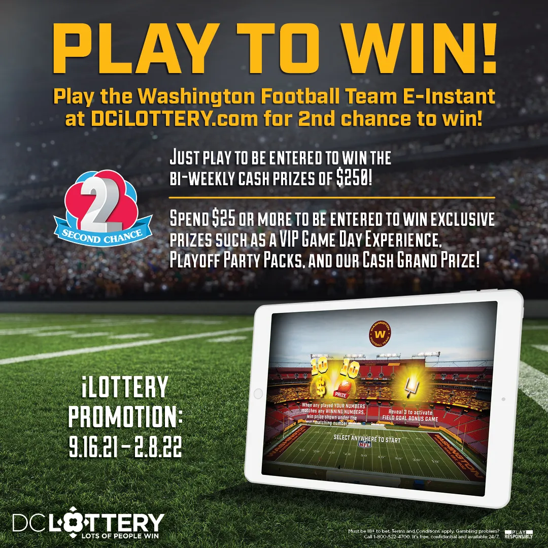 Playoff Party Pack Giveaway: There will be two (2) prizes awarded. Entry criteria is one entry for every $25 spent per player. One (1) Party decorations (value is $21.00); one (1) Washington Football Team baseball cap (Approximate Retail Value (“ARV”): $24.99); one (1) Washington Football Team sweatshirt (ARV: $59.99); one (1) Washington Football Team t-shirt (ARV: $29.99); five (5) Washington Football Team face mask (ARV”: $19.99 each). A $2,000 cash prize provided by DC Lottery. The total prize package value is approximately $2,235.92 (less applicable taxes and withholdings). $2,000 in real money will be added to the players iLottery account within 48 hours of the completion of the required claims documents. |