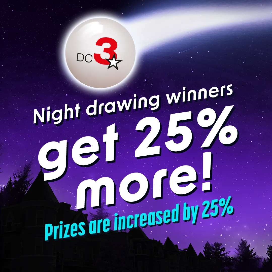 Play the DC 3 NIGHT drawing online or at any DC Lottery retailer for a chance to increase your winnings by 25%.
